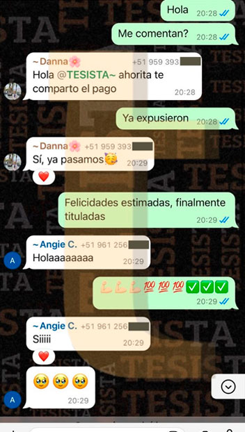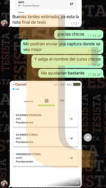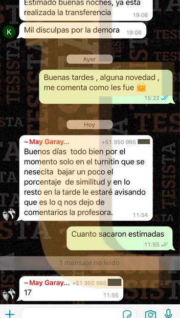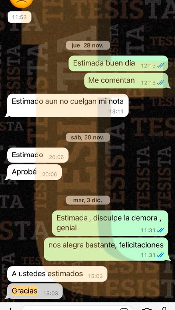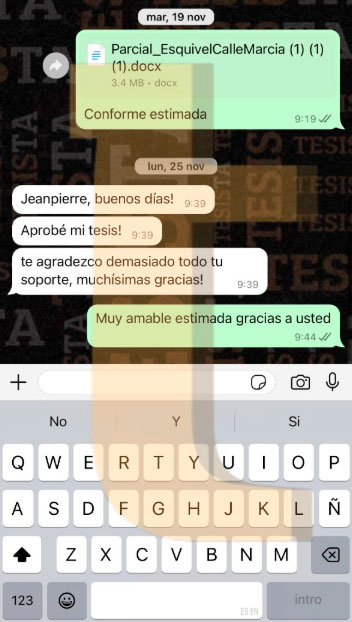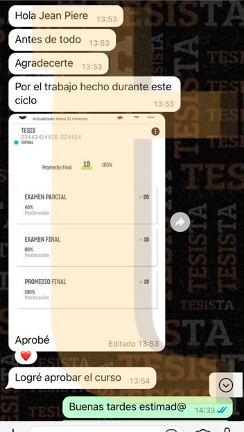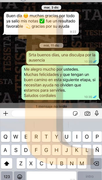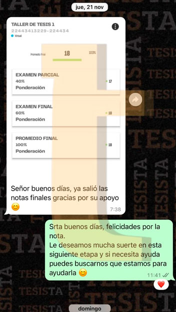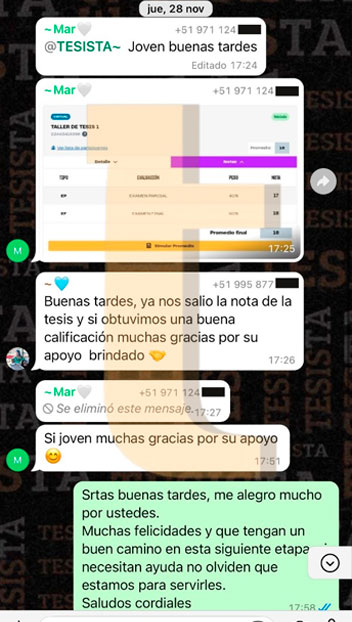 Hola @TESISTA. Joven buenas tardes. Buenas tardes, ya nos salió la nota de la tesis y obtuvimos una buena calificación muchas gracias por su apoyo brindado. Si joven muchas gracias por su apoyo. Srta. buenas tardes, me alegro mucho por ustedes. Muchas felicidades y que tengan un buen camino en esta siguiente etapa, si necesitan ayuda no olviden que estamos para servirles. Saludos cordiales.