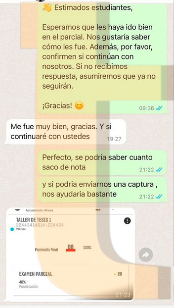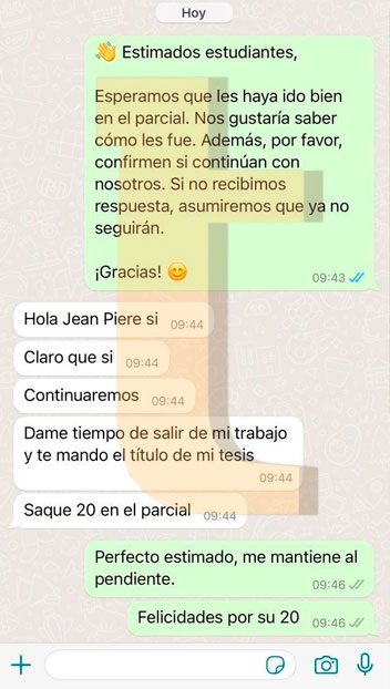 Estimados estudiantes, Esperamos que les haya ido bien en el parcial. Nos gustaría saber cómo les fue. Además, por favor, confirmen si continúan con nosotros. Si no recibimos respuesta, asumiremos que ya no seguirán. ¡Gracias! Me fue muy bien, gracias. Y si continuaré con ustedes. Perfecto, se podría saber cuanto saco de nota.